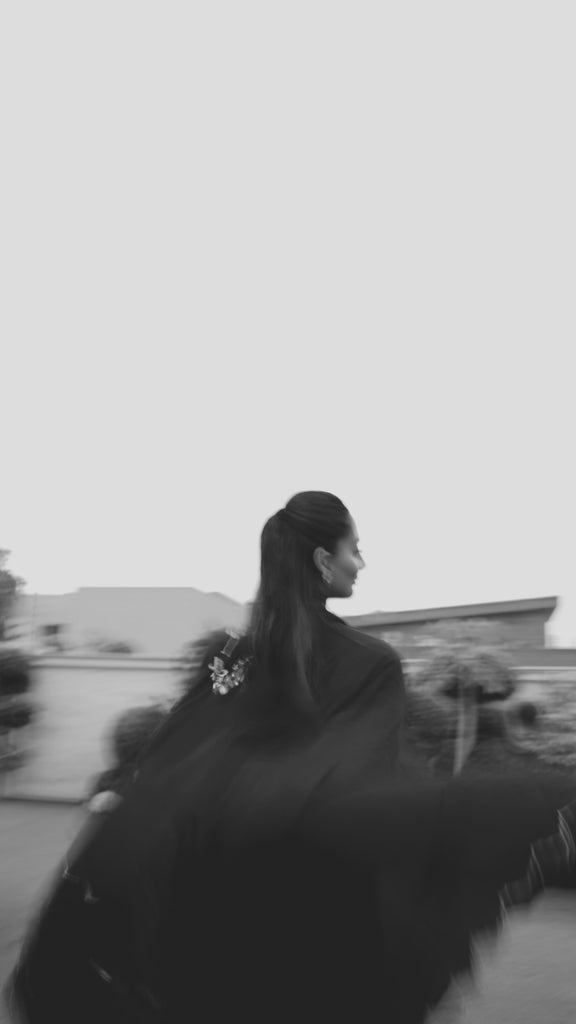 An ode to midnight elegance : Lunara drapes you in jet black raw silk, brought to life with bursts of multicoloured embroidery. The fully worked neckline flows into intricately adorned sleeves, while embroidery graces the slits and hem, creating harmony in every detail. At the back, ornate motifs add a touch of surprise. The farshi shalwar lends a regal fall, and the silk Dupatta; finished with scalloped edges, scattered floral bootis, and artfully placed motifs; completes this timeless, statement-making ensemble.