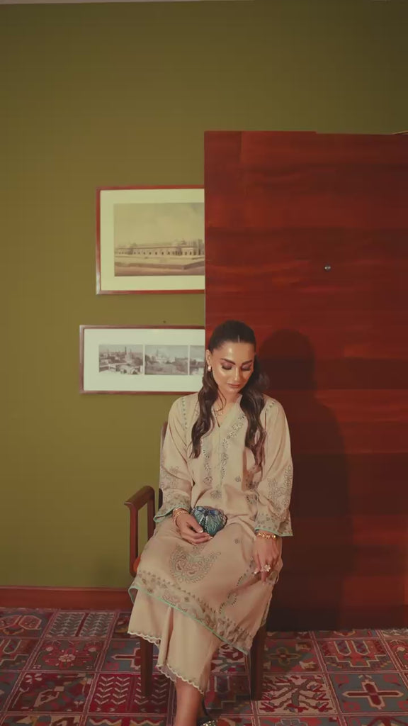 Crafted in premium silk karandi, Stonella showcases delicate teal and biscuit-gold embroidery over a refined stone-beige canvas. The shirt features bead-detailed neckline, intricate front motifs, and matching embroidery at the back. Coordinated wide-leg pants with scalloped edges complete this beautifully composed set.
