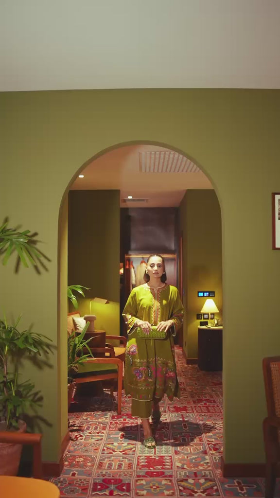 Verdura is crafted in rich olive silk karandi, designed as a two-piece set that celebrates colour, texture, and detail. The neckline features delicate embroidery, while the sleeves carry bold patterned work that adds rhythm and structure to the silhouette.